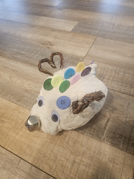 We went into my craft room, where Ella immediately started opening drawers where I store things like string, wire, clay, buttons, and miscellaneous crafts. Then she set to work making a dinasour. I love that she saw some small grapevine wreath hearts and immediately said, “I have my dinasour wings!” She has such a great imagination.